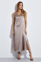 Стильное вязаное платье полуприлегающего силуэта выполнено из хлопковой итальянской пряжи. Изделие имеет V-образный вырез горловины, длинные свободными рукава с манжетой. Разрез в боковом шве и длина миди создают элегантный образ. Длина платья около 117 см.