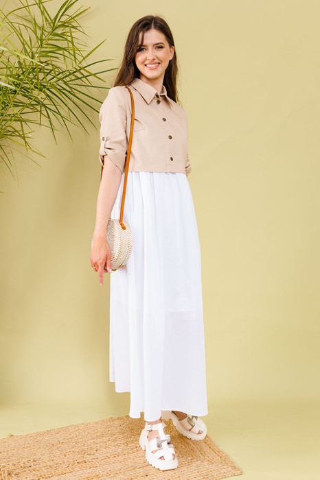 Лёгкое комбинированное платье, состоящее из лифа и юбки. Лиф прямого кроя с втачным рукавом с манжетой и патой на кнопки. Горловина обработана рубашечным воротником с отрезной стойкой. Застёжка центральная на кнопки. Юбка А-силуэта на подкладке.
