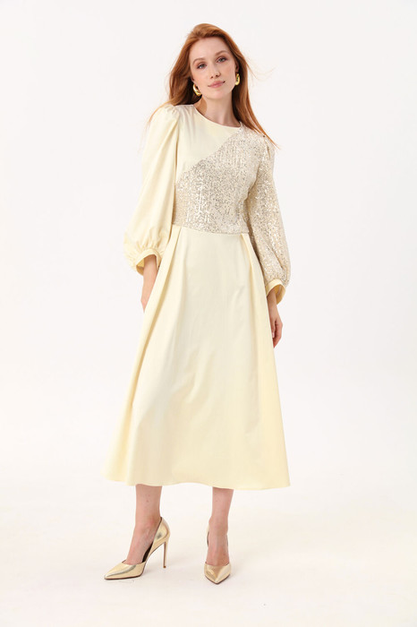 Платье длиной миди, отрезное по линии талии.По переду нагрудные вытачки переведены в талиевые. Лиф спинки со средним швом, талиевыми и плечевыми вытачками. Юбка со складками на линии талии, расширена к низу. В среднем шве спинки застежка на потайную молнию. Горловина обработана обтачкой. Рукава широкие, втачные,одношовные. По окату рукава заложены мягкие складки. Нижний срез рукава со сборкой, обработан бейкой. Карманы в боковых швах. Рукава и часть лифа платья декорированы кружевной сетчатой тканью с пайетками.