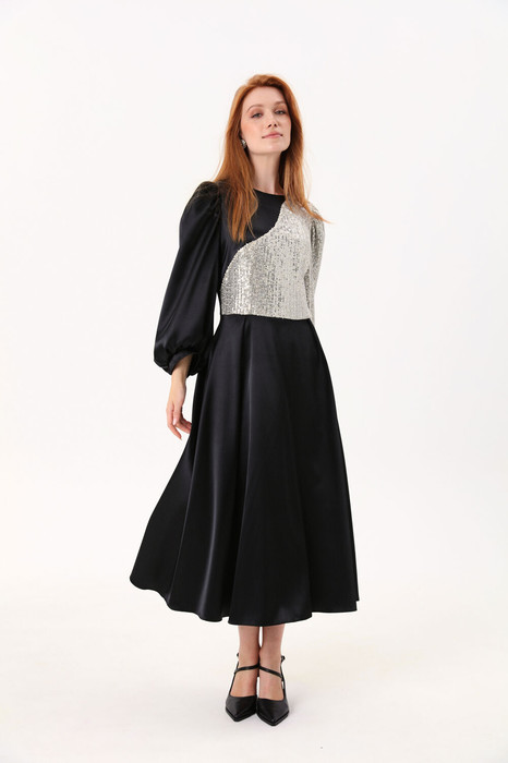 Платье длиной миди, отрезное по линии талии.По переду нагрудные вытачки переведены в талиевые. Лиф спинки со средним швом, талиевыми и плечевыми вытачками. Юбка со складками на линии талии, расширена к низу. В среднем шве спинки застежка на потайную молнию. Горловина обработана обтачкой. Рукава широкие, втачные,одношовные. По окату рукава заложены мягкие складки. Нижний срез рукава со сборкой, обработан бейкой. Карманы в боковых швах. Рукава и часть лифа платья декорированы кружевной сетчатой тканью с пайетками.