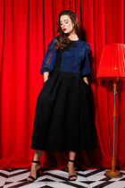 Утончённое комбинированное платье прилегающего силуэта длиной макси. На деталях полочек фигурные рельефы. Застежка платья на разъемную молнию в среднем шве полочки. На спинке средний шов и фигурные рельефы.Рукав реглан длинный и двухшовный. Вырез горловины округлой формы, оформленный отложным воротником.