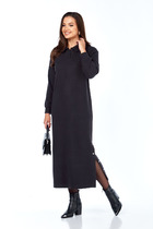 Комбинированное платье А-образного силуэта, отрезное по линии талии. Лиф изделия выполнен из трикотажной ткани, рукава и юбка - плательной. По переду и спинке вертикальные рельефы. Рукав втачной, низ рукава оформлен резинкой. Воротник - стойка. Застежка на тесьму -молнию, расположенную по центру переда и на воротнике. Изделие без подкладки.
