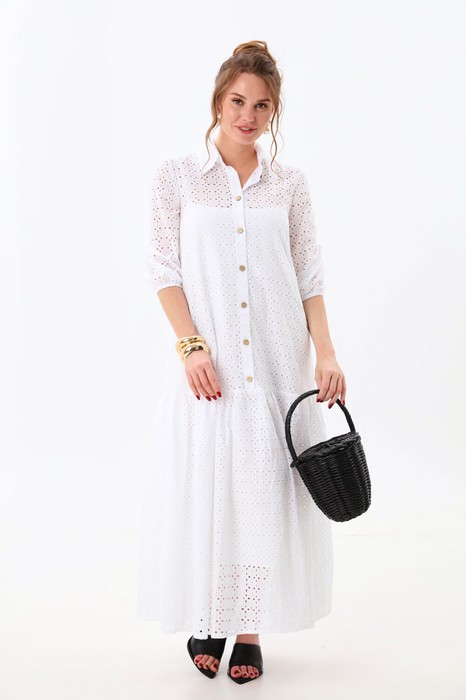Платье состоит из двух платьев: нижнего и верхнего. Верхнее платье макси прямого свободного силуэта с воланом по низу изделия. Рукав втачной. Горловина обработана плосколежащим воротником. Центральная застёжка на петли и пуговицы. Нижнее платье комбинация на регулируемых бретелях.