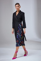 Платье комбинированное из двух тканей. Нижняя часть платья прямого силуэта, длинная , со сборкой по линии талии из отделочной ткани. Юбка на подкладке. Верхняя часть платья из основной ткани, частично на подкладке. Прямой силуэт, воротник пиджачного типа, рукав одношовный, втачной , с незначительно спущенной линией плеча, длинный, с притачной манжетой, декорированной разрезом. По линии ткани настрочная кулиса с завязками из основной ткани. Застежка центрально-бортовая на одну петлю и пуговицу функциональную и две пуговицы- имитация. Линия низа верхней части фигурная ассиметричная.
