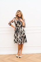 Платье прямого силуэта, состоящее из комбинации двух тканей - основной и отделочной. Воротник цельнокроеный хомут. Рукав одношовный, втачной, длинный. Нижняя юбка из отделочной ткани, со сборкой по линии талии. В виде отделки по левой части переда декоративный цветок из отделочной ткани.