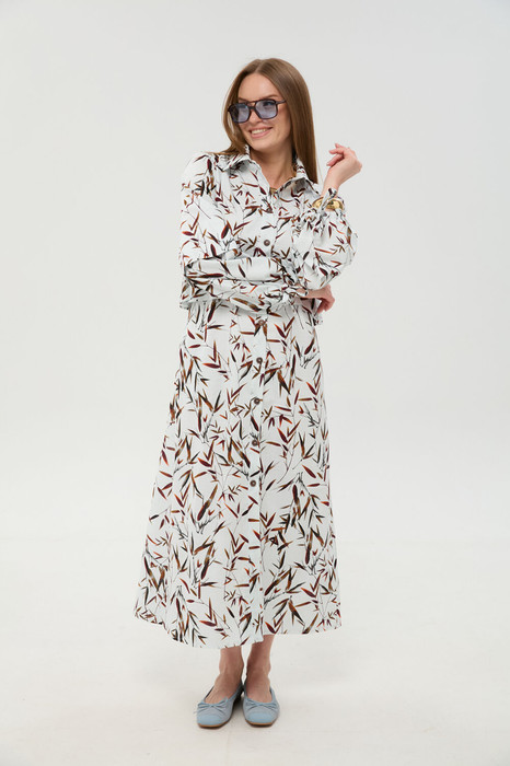 Платье макси с центральной отрезной застёжкой на потайную планку на петли и пуговицы.По переду и спинке цельнокроеные складки на уровне талии. Рукав втачной,одношовный рубашечноно типа. По низу рукава пробиты петли и вставлена завязка для фиксации сборки . Воротник рубашечный стояче отложной. В комплект к изделию идёт пояс из основной ткани для максимально комфортного регулирования объёма.