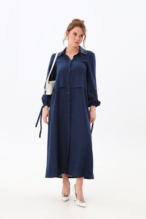 Платье макси с центральной отрезной застёжкой на потайную планку на петли и пуговицы.По переду и спинке цельнокроеные складки на уровне талии. Рукав втачной,одношовный рубашечноно типа. По низу рукава пробиты петли и вставлена завязка для фиксации сборки . Воротник рубашечный стояче отложной. В комплект к изделию идёт пояс из основной ткани для максимально комфортного регулирования объёма.