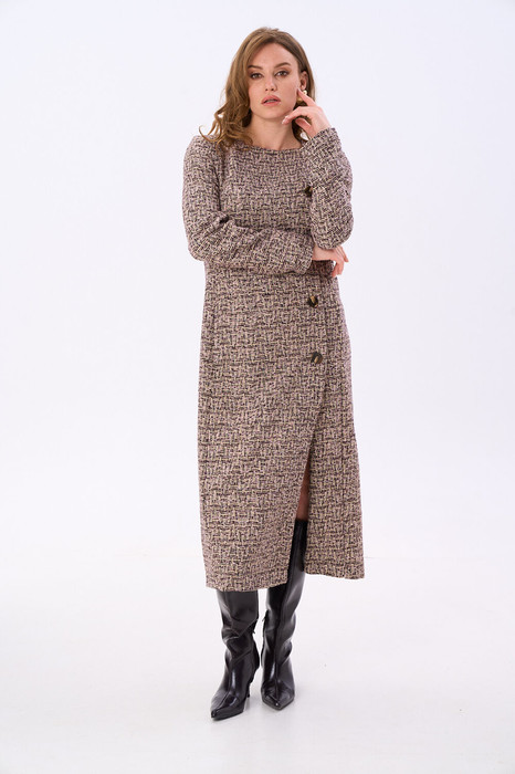 Платье длиной миди полуприлегающего силуэта.Застежка по переду бортовая, смещена в сторону левого бока, на  петли и пуговицы. Перед с рельефами из проймы, с нагрудной вытачкой и карманом. Нагрудная вытачка из рельефного шва. Спинка с плечевой вытачкой из плечевого шва и рельефами из проймы. В среднем шве спинки шлица. Рукав втачной, двухшовный. Вырез горловины переда имеет квадратную форму.