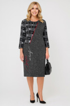 Платье женское прилегающего силуэта, выполнено из трикотажного полотна «велюр». Модель асимметричная, без подкладки, с плечевыми накладками. Перед платья состоит из двух частей перекрученных между собой по линии талии и скрепленных за запах. Перекрут деталей переда образует драпировку. На спинке расположены талиевые вытачки, в среднем шве – застежка на тесьму-«молнию» (50 см). Горловина округлой формы, углубленная спереди. Рукав длинный, втачной. Длина платья – 132 см, длина рукава – 57 см.