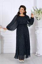 Платье женское, полуприлегающего силуэта, выполнено из гипюра и плательной ткани «сатин». Перед и спинка состоят из двух разных по длине слоев: нижний короче верхнего на 5 см. Модель без подкладки, без рукавов и плечевых накладок, без воротника. Низ платья оформлен фестонами. Перед с нагрудными вытачками в верхнем и нижнем слоях. Спинка с талиевыми вытачками и средним швом, в верхней части которого обработана застежка на потайную тесьму-«молнию» (50см), в нижней – разрез.  Вырез горловины переда и спинки округлый, углубленный по переду. В шов обтачивания горловины входит пелерина из шифона, разъемная по середине переда и спинки; низ пелерины асимметричный, укороченный спереди. Верхний и нижний слои платья скреплены по среднему шву, плечевым и проймам. Длина платья (верхний слой) - 107 см.