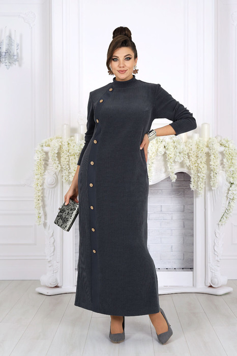 Платье женское полуприлегающего силуэта, выполнено из фактурного трикотажного полотна с рубчиком. Модель без подкладки, без застежки и плечевых накладок. В левом боковом шве обработана шлица с застежкой на 5 петель и 5 декоративных пуговиц. Перед платья асимметричный: с нагрудной вытачкой на левой части переда и планкой с декоративными пуговицами на правой; планка выполнена из гладкого отделочного трикотажного полотна. Спинка с талиевыми вытачками. Круглая горловина оформлена невысокой стойкой. Рукав втачной, длинный.