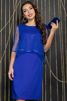 Платье женское, полуприлегающего силуэта, выполнено из гипюра и плательной ткани «сатин». Перед и спинка состоят из двух разных по длине слоев: нижний короче верхнего на 5 см. Модель без подкладки, с плечевыми накладками. Низ платья и рукавов оформлен фестонами. Перед в верхнем и нижнем слоях с нагрудными вытачками, выходящими из пройм. Спинка с талиевыми вытачками и средним швом, в верхней части которого обработана застежка на потайную тесьму-«молнию» (50см), в нижней – разрез. Вырез горловины переда и спинки округлый, углубленный по переду. Рукав короткий, втачной. Верхний и нижний слои платья скреплены по среднему шву, плечевым и проймам. Длина платья (верхний слой)-108 см, длина рукава-26 см.