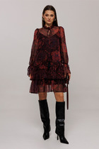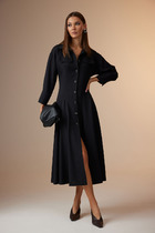Элегантное трикотажное платье прямого кроя с разрезом по низу переда. Платье имеет слегка спущенную линию плеча. Горловина с женственным вырезом и широким воротником.