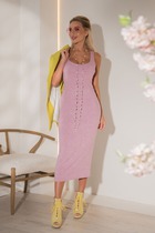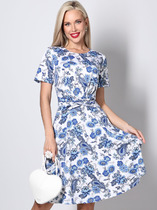 Элегантное платье выполнено из трикотажного полотна с люрексом. Платье отрезное по линии талии, собрано на резину по шву притачивания. Верх платья с удлиненной линией плеча и свободной заниженной проймой. Длина рукава от горловины в 46 р-ре – 21 см. в 60 р-ре – 27 см. Перед платья с глубоким запахом, образующим V-образный вырез. Спинка со средним швом. Горловина спинки обработана обтачкой. Юбка платья по переду с глубоким запахом. Спинка целая. Низ платья фигурный, ассиметричный. Платье без застежек и подклада. Длина изделия по спинке в 46 р-ре – 121 см. в 60 р-ре – 129 см.