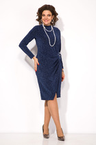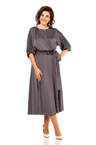 Нарядное платье из струящейся ткани, отрезное по линии талии. Верх летучая мышь, по низу рукава сборка и притачная манжета. Вырез горловины округлой формы. По переду ассиметричная деталь от плеча до линии подреза. По линии подреза резинка. Нижняя часть платья клеш. К платью прилагается интересный  пояс, украшенный стразами.