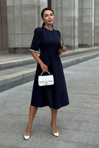 Платье женское, полуприлегающего силуэта, втачного покроя. Выполнено из трикотажного плательного полотна с блеском. Горловина округлой формы, задекорированная отделочной тесьмой по форме горловины переда. Спинка с талиевыми вытачками и средним швом, в котором расположена тесьма-молния. Рукава 7/8 с разрезом по шву до локтя. По переду расположены нагрудные вытачки и подрез закругленной формы, переходящий в разрез. Платье по фигуре  и книзу заужено.