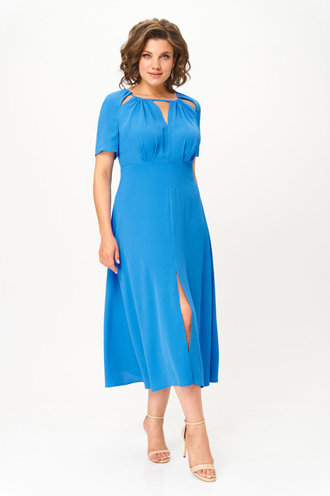 Платье женское полуприлегающего силуэта, отрезное выше талии. Нижняя часть со средним швом и разрезом. Спинка цельная, по отрезной линии талии собрана на  резинку. Вся верхняя часть платья (перед, спинка и рукава) собраны на сборку протягивающимся шнуром, который завязывается сзади. По верхним частям переда и спинки разрезы. Рукав короткий, покроя «реглан».