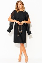 Платье женское полуприлегающего силуэта, втачного покроя рукава, выполнено из костюмной ткани с шифоновыми рукавами с металлизированной нитью. По переду отрезное по линии талии, верхняя часть, верхняя часть на подкладке, состоит из кокетки и лифа со складками, идущими на запах. Горловина «V - образной» формы. Спинка с талиевыми вытачками и средним швом, в котором разрез и застежка на тесьму-молнию. Рукав одношовный, длинный со сборкой по окату и собранный на резинку по низу. Дополнением служит пояс с пряжкой из основной ткани.