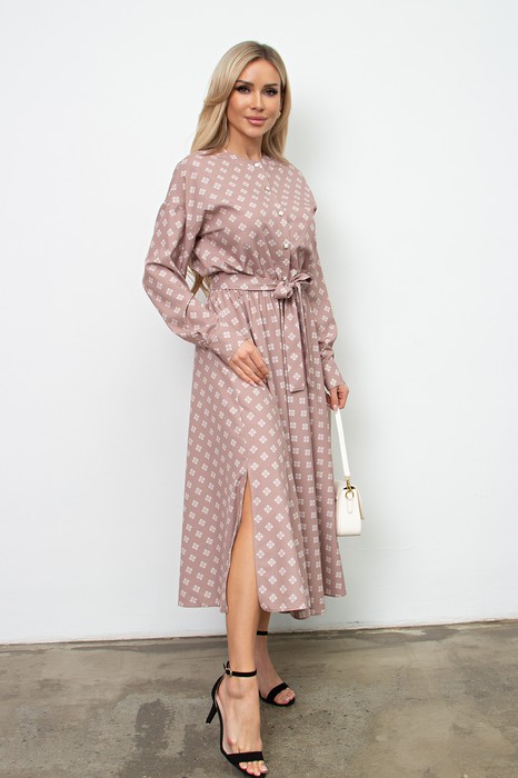 Романтичное платье приталенного силуэта из легкой ткани Ниагара. Длинный втачной рукав со спущенным плечом, оканчивается притачной манжетой. Округлая горловина оформлена стойкой, переходящей в планку с застежкой на петли и пуговицы. Модель отрезная по линии талии, присборена на эластичную резинку. Юбка расклешенного силуэта. Низ ровный, по бокам разрезы. Пояс из основной ткани в комплекте.