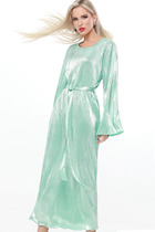 Летящее платье свободного силуэта из текстильной ткани шифон зелено-фиолетового цвета. V-образный вырез изделия обработан внешней обтачкой. По переду изделия выполнена планка с застежкой на пуговицы. Платье с завышенной линией талии и отрезной юбкой. Юбка изделия состоит из широких воланов дополненных сборкой. По низу втачных рукавов декоративная оборка. Длина изделия по спинке от плечевого шва до низа изделия — 107 см. Рост фотомодели — 170 см.