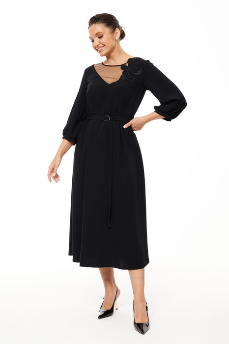 Платье женское прямое из струящейся ткани для повседневной и торжественной носки. Перед имеет две нагрудные вытачки и декоративный узор со стразами. Спинка со средним швом и потайной застежкой-молнией. Горловина круглая со вставкой в виде сетки V-образная. Рукава втачные, чуть ниже локтя, низ рукава со сборкой обработан притачной манжетой. Для придания формы в области талии имеется пояс. Красивое и утонченное платье в котором вы будете в центре внимания, а главное, что вам в нем будет очень комфортно.