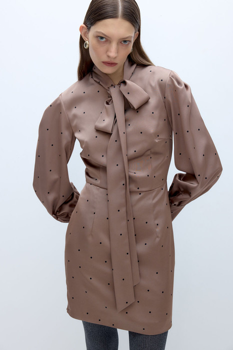 Детали: прилегающий силуэт, вортник-бант, нагрудные и талиевые вытачки, потайная застежка по спинке, втачные длинные рукава со сборкой и застежкой на навесные петли и пуговицы, платье на подкладке 100% хлопок.