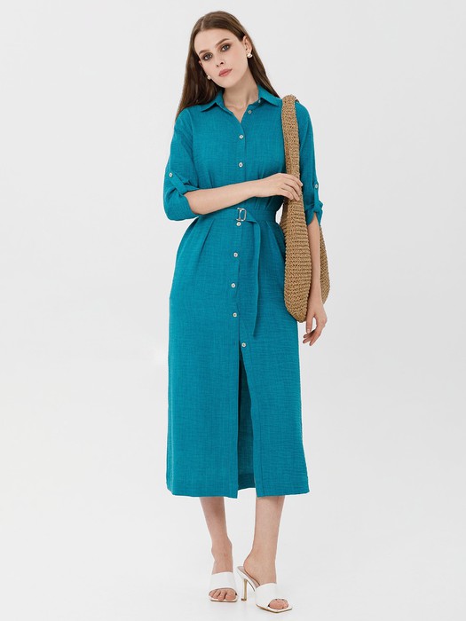 Застежка центральная, на планке переда, на петли и пуговицы. Воротник отложной, с отрезной стойкой. Рукав комбинированный, длиной ?. Нижняя часть рукава рубашечного типа, верхняя - цельнокроеная с кокеткой переда и спинки. Длина рукава регулируется с помощью хлястика. Средний шов спинки снизу заканчивается шлицей. В боковых швах карманы. Талия подчеркнута съемным поясом с металлической пряжкой. Платье декорировано отделочными строчками.