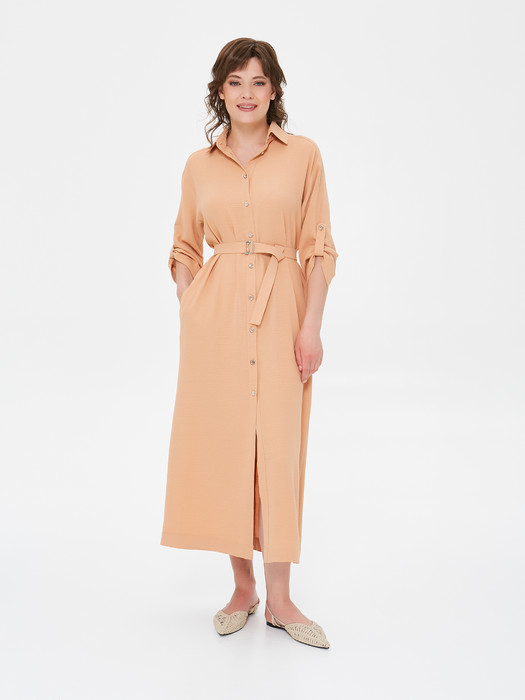 Застежка центральная, на планке переда, на петли и пуговицы. Воротник отложной, с отрезной стойкой. Рукав комбинированный, длиной ?. Нижняя часть рукава рубашечного типа, верхняя - цельнокроеная с кокеткой переда и спинки. Длина рукава регулируется с помощью хлястика. Средний шов спинки снизу заканчивается шлицей. В боковых швах карманы. Талия подчеркнута съемным поясом с металлической пряжкой. Платье декорировано отделочными строчками.