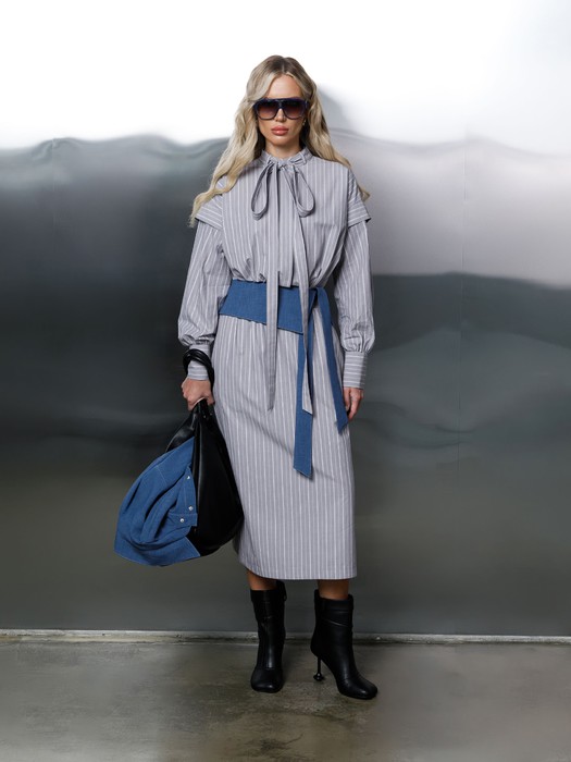 Модель прямого силуэта, со спущенным плечом, отрезное по талии, с втачным поясом, частично собранным на резину. В верхней части переда потайная застёжка на петли и пуговицы. Спинка с кокеткой, под кокеткой отлетная планка. В боковых швах карманы. В среднем шве спинки обработана шлица. Воротник стойка со шлёвками, в которые вставлен съёмный завязывающийся бант. По окату рукава декоративная планка, по низу разрез, сборка и широкая манжета с застёжкой на пуговицы.