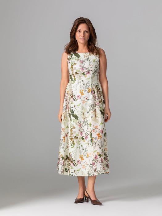 Модель полуприлегающего силуэта, расширенная к низу, без рукавов, без подклада. Перед и спинка с рельефами, бочки с наклонными подрезами и сборкой. В левом боковом шве потайная застёжка молния.