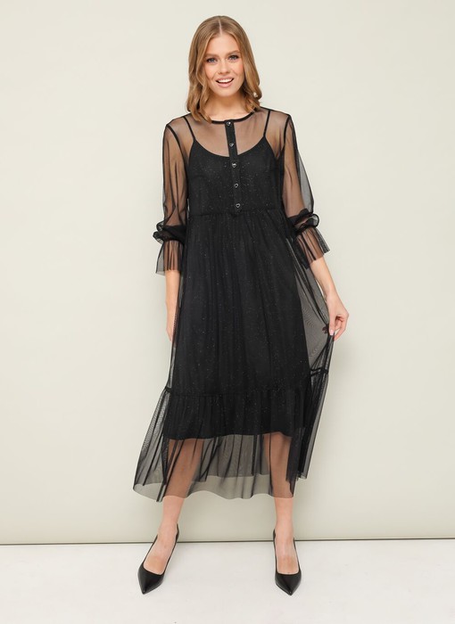 Платье состоит из верхнего платья из фатина - невероятно легкого воздушного и нижнего платья-комбинации. Фатин с легким блеском.