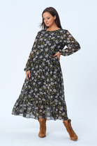 Романтичное платье свободного силуэта на запах  длиной миди. Платье отрезное по линии талии и сборкой по юбке. Рукав вточной одношовный 3/4 на резинке снизу.                                                                Длина изделия - 119 см. Длина рукава - 40 см.