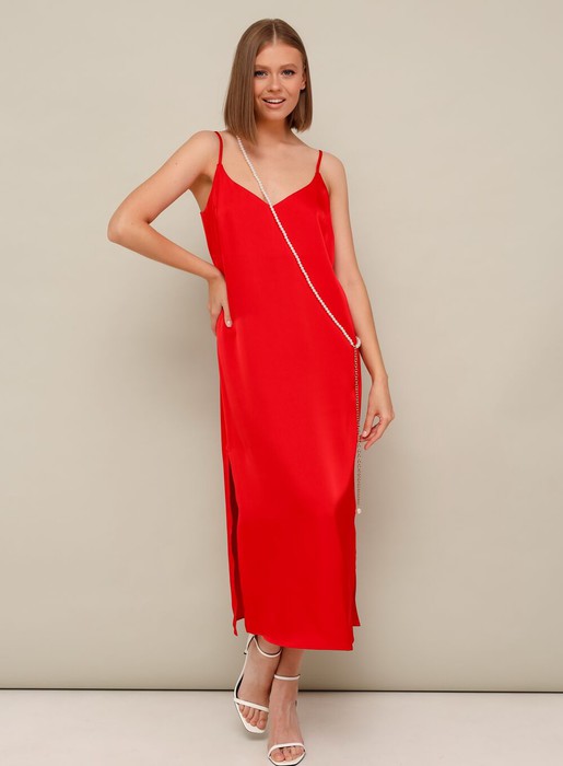 из струящейся ткани с благородным матовым блеском. Перед с нагрудными вытачками. В боковых швах по низу обработаны высокие разрезы. Бретели регулируются по длине. В комплекте к платью прилагается жемчужная цепочка. Платье без подкладки.