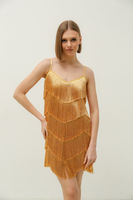 декорировано настрочной тесьмой с бахромой. Бретели регулируются по длине.