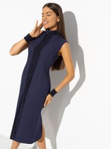 Платье отрезное по линии талии, полуприлегающего кроя, выполнено из плательной струящейся ткани. Горловина с рубашечным воротником на притачной стойке. Лиф с центральной застежкой на потайную планку на петли и пуговицы. По талии обработана резинка для регуляции размера. Юбка с имитацией запаха с застежкой на притачной пояс из основной ткани, который фиксируется на бант. Рукава длинные с притачной манжетой с застежкой на пуговицы.