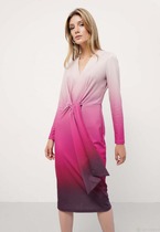 Элегантное платье прилегающего силуэта отрезное по линии талии, выполнено из костюмно-плательной ткани. V-образный вырез горловины с имитацией запаха, с углубленным воротником шалевого типа, прикрывающий руки. По краю воротника и в вертикальном подрезе юбки обработана отделочная деталь контрастного цвета. Спинка со средним швом, переходящим в шлицу.