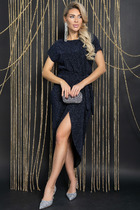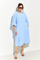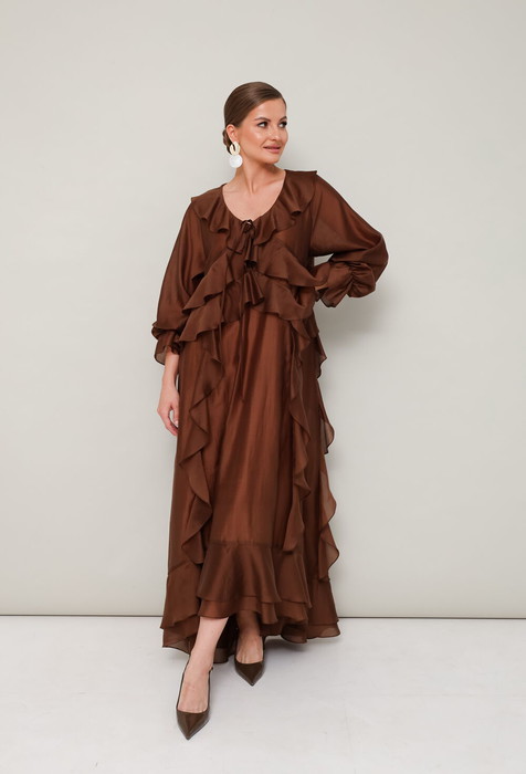 Летящее платье А-силуэта, выполнено из полупрозрачной вискозной ткани. Горловина с V-образным вырезом-каплей с завязками. Лиф переда с подрезами с воланами, переходящими на спинку. Юбка с вертикальными подрезами с воланами. Рукава-реглан с манжетами на резинке. Низ фигурной формы. Платье обработано подкладкой.