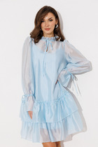 Платье-жакет полуприлегающего кроя, выполнено из костюмной ткани. Воротник пиджачного типа с отложными лацканами. Двубортная застежка на петли и пуговицы. Перед с имитацией запаха с застежкой на акцентную кнопку. Рукава втачные двухшовные. Спинка с рельефами и средним швом. Платье-жакет на подкладке.