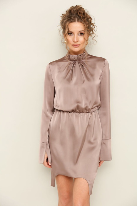 Стильное платье полуприлегающего силуэта, выполнено из струящейся ткани с матовым блеском. Платье отрезное по линии талии на резинке. Горловина с отрезной стойкой и лиф переда декорированы складками. Втачные длинные рукава с манжетами. В среднем шве спинки  обработана застёжка на стойке на пуговицы и навесные петли. Низ платья фигурной формы.