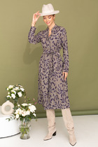 Легкое платье прямого силуэта. Округлая горловина на внутренней обтачке. Короткие цельнокроеные рукава, оканчиваются манжетами на отворотах. В среднем шве спинки расположен разрез с застежкой на пуговицу. Пояс из основного материала в комплекте. Низ ровный, без разрезов.