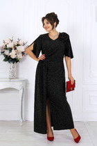 Платье полуприлегающего силуэта, выполненное на запах, длиной до середины бедра. Платье отрезное по линии талии. Лиф спинки со средним швом и рельефами. Лиф переда с рельефами от пройм до подреза по талии. Юбка спинки со средним швом и талиевыми вытачками. Юбка переда ассиметричная: правый перед укорочен, левый перед удлинен. Воротник пиджачного типа. Рукава двушовные, втачные, длиной до локтя. Застежка по переду на петли и пуговицы. Платье на подкладке с плечевыми накладками.