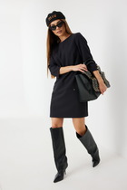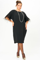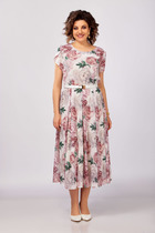 Платье женское А-силуэта, длинное, предназначено для повседневной носки. Перед цельнокроеный двумя нагрудными вытачками. Спинка цельнокроеная. Рукав короткий, одношовный. Горловина без воротника, круглая, обтачная. Платье на подкладке. Перед платья декорируется пришивным украшением из ткани, в центре которого одна страза. Длина спинки 110 см. Длина рукава 16.5 см