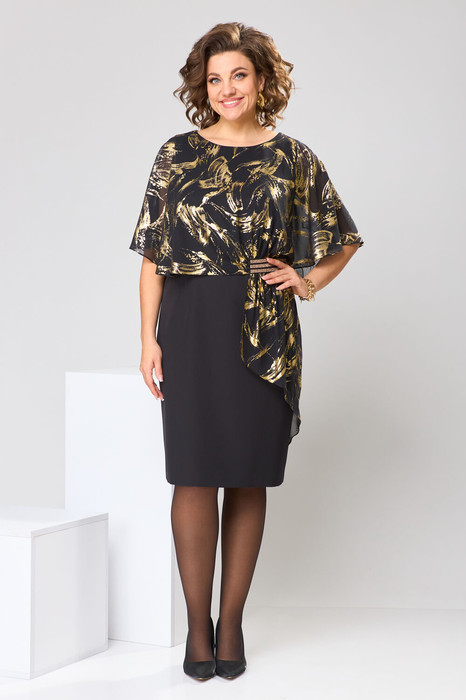 Платье женское относится к нарядной торжественной одежде. Платье полуприлегающего силуэта, с отлетной накидкой длиной за колено. Перед с двумя нагрудными вытачками, с двумя талиевыми вытачками. Спинка с двумя талиевыми вытачками и средним швом, заканчивающимся шлицей. Застежка на потайную тесьму-молнию в среднем шве спинки. Горловина круглая, обтачная, без воротника, по горловине закреплена накидка. Слева на уровне линии талии отделочным хлястиком, декорированным тесьмой накидка закрепляется на платье, нижняя часть накидки закреплена в левом боковом шве. Накидка с фигурным низом. Платье без рукавов. Длина спинки 103 см. Длина накидки от горловины 38 см