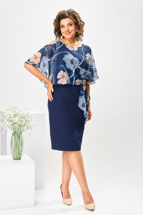 Платье женское относится к нарядной торжественной одежде. Платье полуприлегающего силуэта, с отлетной накидкой длиной за колено. Перед с двумя нагрудными вытачками, с двумя талиевыми вытачками. Спинка с двумя талиевыми вытачками и средним швом, заканчивающимся шлицей. Застежка на потайную тесьму-молнию в среднем шве спинки. Горловина круглая, обтачная, без воротника, по горловине закреплена накидка. Слева на уровне линии талии отделочным хлястиком, декорированным тесьмой накидка закрепляется на платье, нижняя часть накидки закреплена в левом боковом шве. Накидка с фигурным низом. Платье без рукавов. Длина спинки 103 см. Длина накидки от горловины 38 см