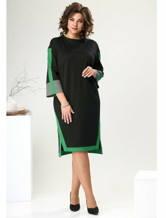 Платье женское для повседневной носки. Платье женское прямого силуэта, длиной за колено, с фигурным низом "ступенька". Перед с двумя нагрудными вытачками. Спинка цельнокроеная. Боковые швы с фигурными разрезами. Разрезы и низ платья с приточными планками из отделочной ткани. Горловина круглая с втачной стойкой. Платье со спущенным плечом. Рукав втачной, длиной 7/8, с приточной вертикальной планкой из отделочной ткани по центру и приточной манжетой из отделочной ткани. Платье без плечевых накладок. Длина рукава от горловины 60 см, длина спинки 103 см.