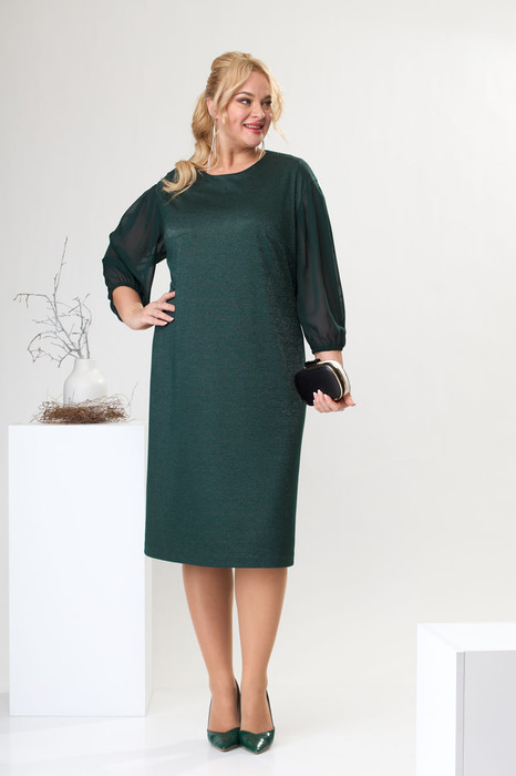 Платье женское относится к нарядной торжественной одежде. Платье женское полу прилегающего силуэта, длиной за колено. Перед с 2-мя нагрудными вытачками. Спинка с 2-мя талиевыми вытачками и средним швом, заканчивающимся шлицей. Горловина круглая, обточная, без воротника. Платье со спущенным плечом. Рукав втачной, одно шовный, длиной 7/8 из отделочной ткани; низ рукава собран на эластичную тесьму; окат рукава с 4-мя односторонними складками и 1-оё встречной по центру. Платье на подкладке. Платье без плечевых накладок. Длина спинки 107 см, длина рукава 43 см, длина рукава от горловины 60 см.
