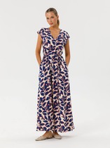 Платье женское, относится к нарядной торжественной одежде. Платье женское полу прилегающего силуэта, длиной за колено, выполнено в виде имитации костюма. Лиф платья отлетной. Перед с 2-мя отрезными бочками, левый бочок с отделочным фигурным поясом, декорированным объёмным украшением, шов притачивания левого бочка с разрезом с закруглёнными концами. Спинка лифа со средним швом и 2-мя отрезными бочками. Лиф платья на подкладке, к которой крепится нижняя часть платья (юбка). Переднее полотнище нижней части с 2-мя таллиевыми вытачками. Заднее полотнище с 2-мя таллиевыми вытачками и средним швом, заканчивающимся шлицей. Нижняя часть платья на подкладке. Горловина круглая, обтачная, без воротника. Застёжка на потайную тесьму-молнию в среднем шве спинки. Рукав втачной, одно шовный, длиной 3/4. Низ рукава со встречной складкой, обточной, складка декорирована пришивной пуговицей. Платье с плечевыми накладками. Длина спинки 104 см, длина рукава 42 см.