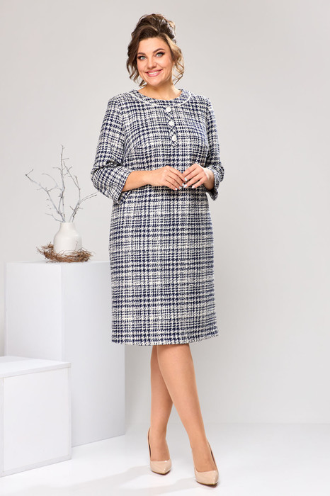 Платье женское, предназначено для повседневной носки. Платье женское А-силуэта, длиной за колено. Перед с 2-мя нагрудными вытачками, с надстрочной вертикальной планкой, декорированной 3-мя пришивными пуговицами, с отрезной притачной планкой по горловине, шов притачивания декорирован отделочной тесьмой с бусинами. Спинка с 2-мя таллиевыми вытачками и средним швом. Платье с карманами в боковых швах. Горловина круглая, обточная, без воротника. Застёжка на потайную тесьму-молнию в среднем шве спинки. Рукав втачной, 2х шовный, длиной 3/4. Платье на подкладке. Платье с плечевыми накладками. Длина спинки платья 98 см. Длина рукава 48 см.