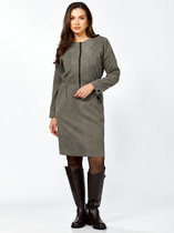 Платье женское предназначено для повседневной носки. Платье женское прямого силуэта, длиной за колено. Перед и спинка цельнокроеные. Горловина круглая с втачной планкой из отделочной ткани. Правый плечевой шов с настрочным погоном из отделочной ткани, декорированным 3-мя пришивными пуговицами. Платье со спущенным плечом. Рукав втачной, одно шовный, длинный с притачной манжетой из отделочной ткани. Низ платья с притачной планкой из отделочной ткани. Платье на подкладке. Платье без плечевых накладок. Длина спинки платья 103,5 см. Длина рукава 47 см, длина рукава от горловины 67 см.
