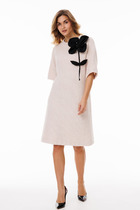 Платье женское, коктейльное. Платье женское, отрезное по линии талии, расширенное к низу, длиной до середины икры. Перед с 2-мя притачными вертикальными планками, верхняя часть с 2-мя односторонними складками по линии талии, нижняя часть переда с 2-мя зафиксированными односторонними складками. Верхняя часть спинки со средним швом и 2-мя односторонними складками по линии талии, нижняя часть так же со средним швом и 2-мя закреплёнными односторонними складками. Горловина круглая с втачным воротником рубашечного типа с отрезной стойкой, верхний воротник из отделочной ткани. Застёжка центральная на 11-ть вертикально обмётанных петель и 11-ть пришивных пуговиц. В боковых швах обработаны карманы. Платье со спущенным плечом. Рукав втачной, одно шовный, длиной 3/4. Окат рукава с 6-ю односторонними складками, низ со сборкой и притачной манжетой собранной на эластичную тесьму. Рукав и манжета из отделочной ткани. К платью прилагается съёмный пояс. Длина спинки 16 см, длина рукава 42,5 см.